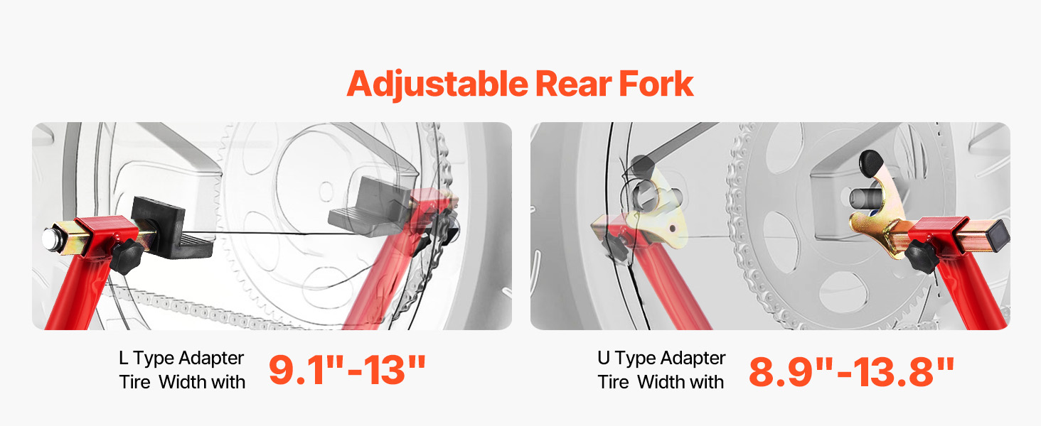 Adjustable Universal Fork Heads: The front wheel stand's dual fork top head has an adjustable width range of 6.5-9.5 inches, while the rear wheel stand's U-shaped fork head has a width range of 8.9-13.8 inches, and the L-shaped fork head ranges from 9.1-13 inches, ensuring a snug fit on both sides of the vehicle for secure support