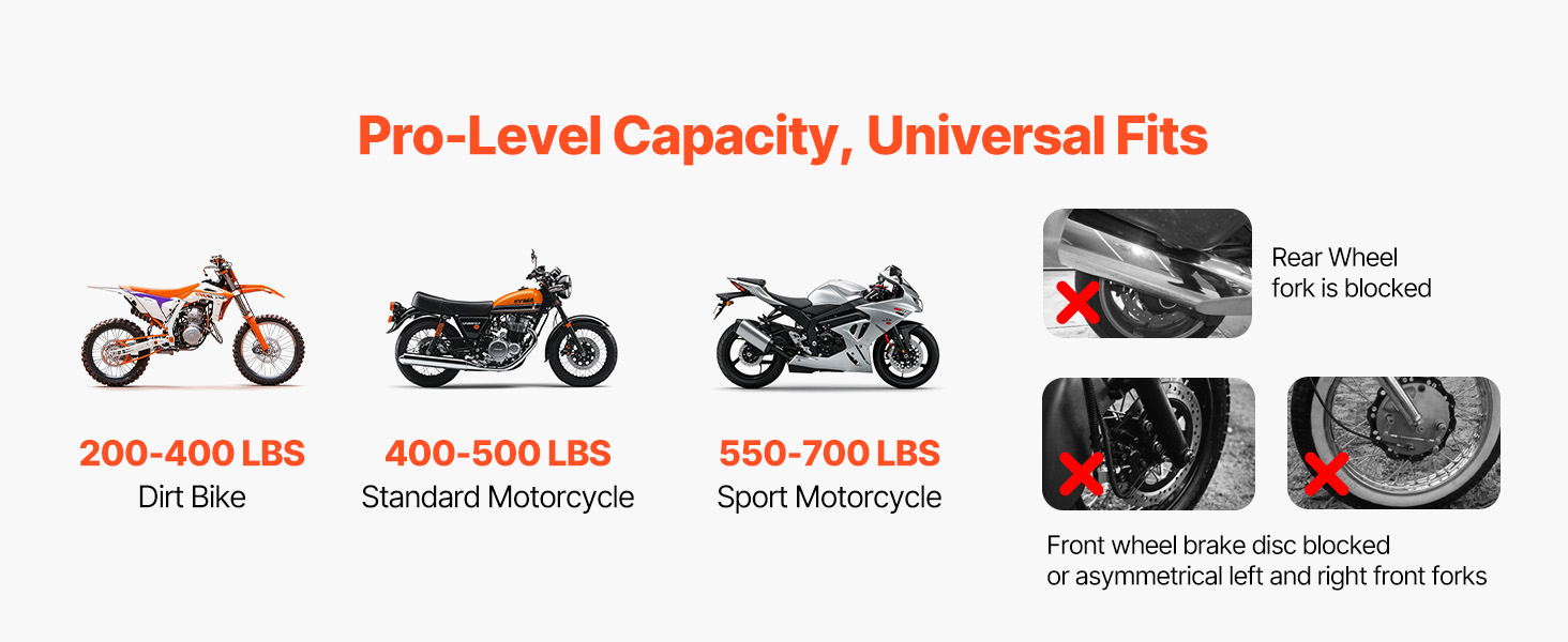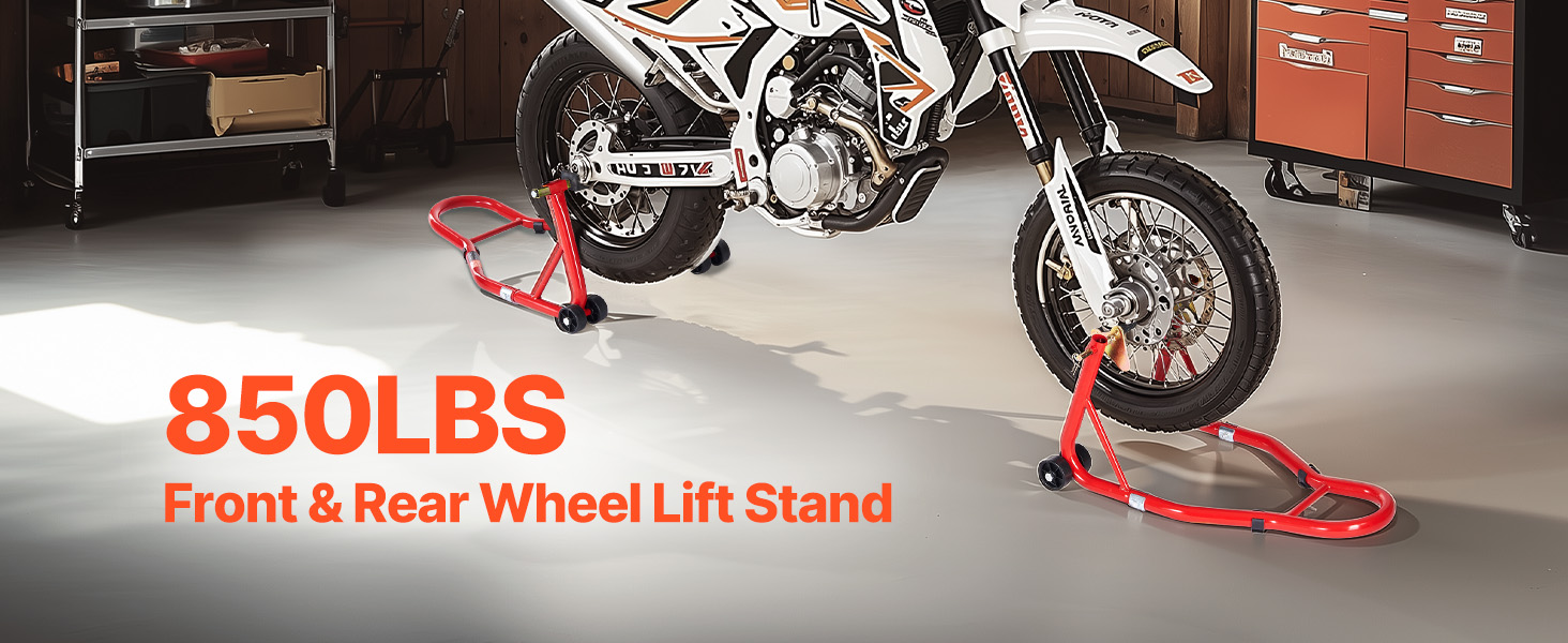 850lbs Load Capacity: The front and rear wheel stands combined can support up to 850 lbs, making them suitable for vehicles with a tire axle width of 13.8 inches or less. They seamlessly cover most motorcycles, including brands like Yamaha, Kawasaki, Honda, Suzuki, and more