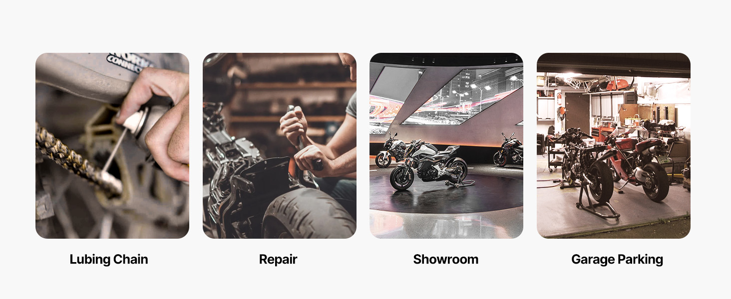 Stable and Strong: Our motorcycle stand is made from heavy-duty steel with thickened walls. The stand’s connection slots are precisely positioned, and upgraded limit clips are reinforced to avoid wobbling during use. The stand’s base is designed with triangular stress points, ensuring it won’t deform even when holding the motorcycle for long periods